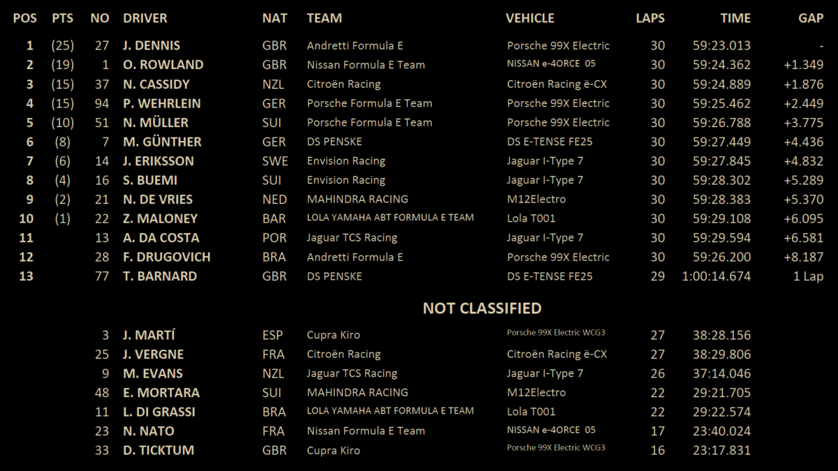 Een enorme crash van rookie Pepe Martí (CUPRA KIRO) – die spectaculair over de Jaguar TCS Racing-auto van Antonio Félix da Costa vloog en gelukkig uiteindelijk veilig landde – betekende een late rode vlag en een sprint van één ronde naar de finish. Dennis wist regerend kampioen Oliver Rowland (Nissan Formula E Team), die helemaal achteraan was gestart op de 13e plaats, en Cassidy achter zich te houden en behaalde daarmee zijn eerste overwinning van het seizoen.