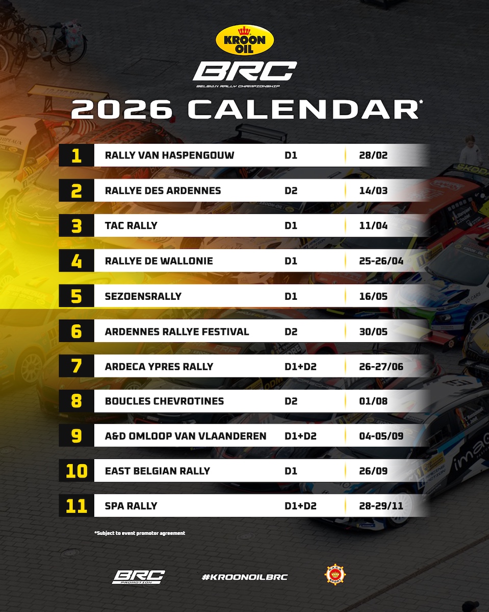 Binnen drie weken opent het Kroon-Oil Belgian Rally Championship 2026 Divisie 1 met de Rally van Haspengouw. Tijd om de krijtlijnen van het Belgisch rallykampioenschap even op een rij te zetten. Het kampioenschap Divisie 1 telt in 2026 acht wedstrijden. De TAC Rally is opnieuw gepromoveerd naar het hoogste niveau. In Divisie 1 scoren de deelnemers met auto’s van de klassen RC2, RC3, RC4, RC5, die nieuwe klasse RC6 en RGT punten. Iedereen kan punten scoren in de acht manches op de kalender en daarnaast nog een negende resultaat inbrengen behaald in een van de drie, vooraf genomineerde, onafhankelijke Divisie 2-wedstrijden: de Rallye des Ardennes, het Ardenne Rally Festival of de Boucles Chevrotines. Van die negen resultaten, komen de beste zes scores in aanmerking voor de eindafrekening in het kampioenschap.